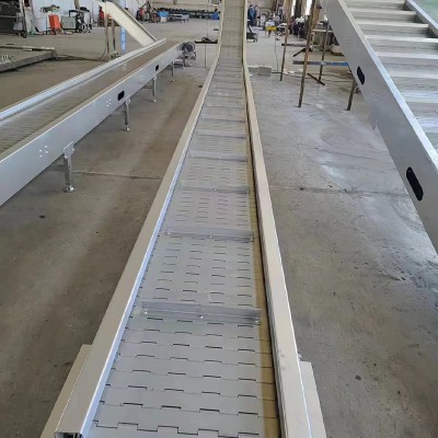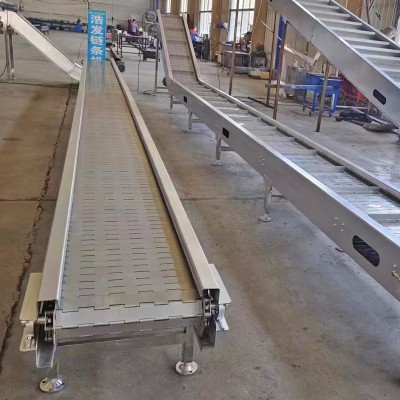 链板输送机是一种以标准链板为承载面,由马达减速机为动力传动的传送装置。链板式输送机,由动力装置(电机)、传动轴、滚筒、张紧装置、链轮、链条、轴承、润滑剂、链板等等构成。其中带动物料的输送的主要的两个部分为:链条,利用它的循环往复运动提供牵引动力;金属板,作为输送过程中的承载体。可以通过多列链板并行,使链板输送机做的很宽并形成差速,利用多列链板的速度差使多列输送在无挤压的情况下变为单列输送,从而满足饮料贴标、灌装、清洗等设备的单列输送的要求,我们可以将两条链板输送机的头尾部做成重叠式的混合链使得瓶(罐)体处于动态过度状态,使输送线上不滞留物料,可以满足空瓶以及实瓶压力和无压力输送。