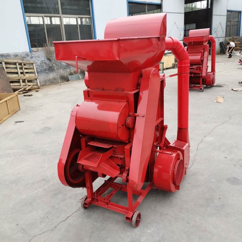 花生脱壳机有机架、风扇、转子、单相电机、筛网(有大小两种)、入料斗、震动筛、三角带轮及其传动三角带等组成。机具正常运转后,将花生定量、均匀、连续地投入进料斗,花生在转子的反复打击、摩擦、碰撞作用下,花生壳破碎。花生粒及破碎的花生壳在转子的旋转风压及打击下,通过一定孔径的筛网(花生次脱粒用大孔筛网,清选后的小皮果更换成小孔筛网进行第二次脱壳),这时,花生壳、粒受到旋转风扇的吹力作用,重量轻的花生壳被吹出机体外,花生粒通过震动筛的筛选达到清选的目的。