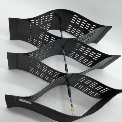 是由高强度的热塑性片材,经过强力焊接而形成的一片网状格室结构。它伸缩自如,运输时可缩叠起来,使用时张开并又充填土石或混凝土料,构成具有强大侧向限制力和大刚度的结构体。它可用来作为垫层,增大软弱地基的承载能力,也可铺设在坡面上构成坡面防护结构,还可以用来建造支挡结构等。
