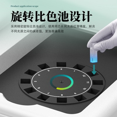 4、检测通道:≥12通道;采用精密旋转比色池设计,使用同芯片同光源校准精度,解决不同光源之间的误差值,更加准确高效。