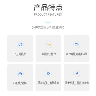 参数标准:有标准物质(钢,锡),用户可自行校正温度上位机为三合一操作软件,同时也适用于热重、同步仪器连用仪器有多组热电偶,一组测试样品温度,一组测试仪器内部环境温度