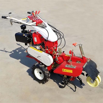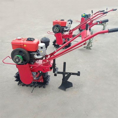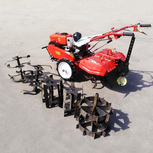 本机器包括机架、可调高低扶手,机架上设有(风冷或水冷)柴油机或汽油机、机架和扶手上设置有变速箱,变速箱的输出轴上设置有能够沿轴移动的驱动轮或链轨.传动方式主要有:全齿轮传动、皮带传动、链条传动三种传动方式.该机具有重量轻,油耗低、相对功率大,结构紧凑、机动性强、操纵轻便灵活的特点。可爬坡、越埂、阶梯性强。广泛适用于平原、山区、丘陵的旱地、水田、果园、菜地、烟地的深旋耕、浅旋耕、犁耕。配上相应机具可进行旱地旋耕、水田旋耕、抽水、开沟、喷淋、喷药除草碎土等作业,还可牵引拖车进行短途运输,是大中型农机无法媲美的多功能田园管理机,工作稳定可靠、使用寿命长、维修方便等特点。是进入农民家庭理想的田园管理机。