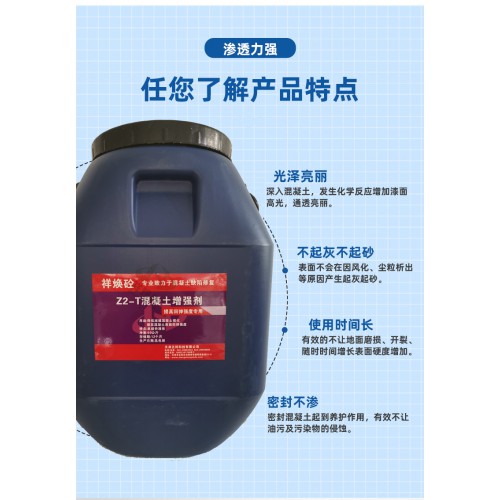 祥焕砼混凝土增强剂,无味、绿色环保,通过与混凝土渗透产生化学反应,形成致密结晶体。施工简便,只需喷洒和涂刷即可达到理想的耐磨、增硬强度、;有 效渗透1~30mm,与混凝土中的物质产生化学反应,形成致密整体;抗压强度提高10%—40%,有 效提高 强度、密度;