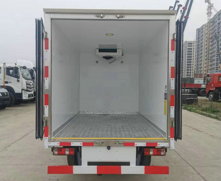 体厢采用璃玻外内钢板,中间8CM保温板,铝花纹滑防底板,右侧开单侧门,铝合金包边,不锈钢门框及锁件。