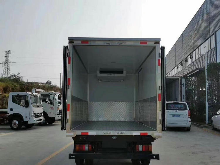 厢体采用内外玻璃钢、中间8CM 厚聚氨酯保温板、底板为防滑花纹铝板,不锈钢门锁件,单开侧门,安装-15度制冷机组,其余标配。