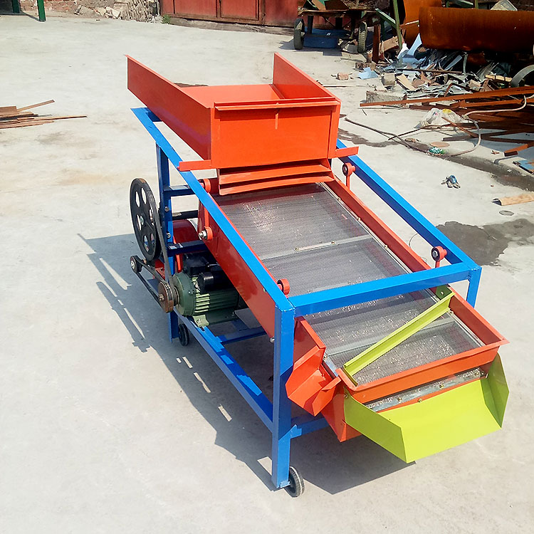 该精选筛为二层筛网,先经过进料口处风机抽风,直接抽走重量轻的杂叶或麦秸秆,上层筛的初次筛分再把大杂清理过,好的粮食(种子)直接落到下层筛网上,下层筛网会把粮食(种子)中的小杂.小石子.有缺陷的粮食(种子)直接漏掉,完好的粮食(种子)会从出料口筛分出来。该小型清粮机解决了扬场机的功能单一,不能有效去除石子.土块的缺陷,更能为清理.净选粮食(种子)带来满意的效果。该机有占地小,移动方便,便以维修,除尘除杂效率明显,能耗低,使用简便等优点。