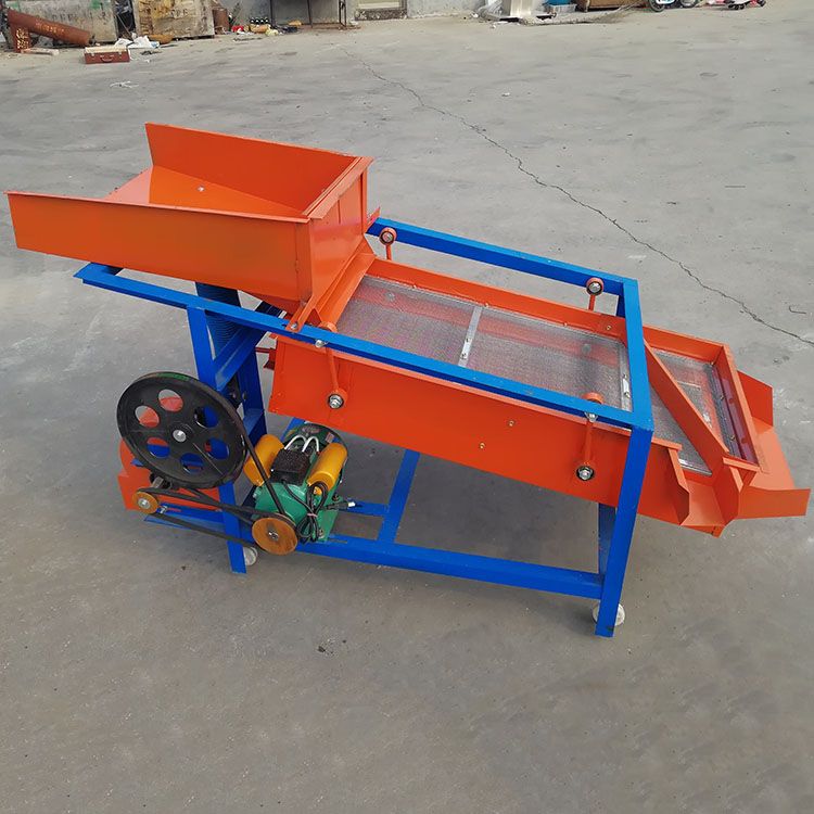 该精选筛为二层筛网,先经过进料口处风机抽风,直接抽走重量轻的杂叶或麦秸秆,上层筛的初次筛分再把大杂清理过,好的粮食(种子)直接落到下层筛网上,下层筛网会把粮食(种子)中的小杂.小石子.有缺陷的粮食(种子)直接漏掉,完好的粮食(种子)会从出料口筛分出来。该小型清粮机解决了扬场机的功能单一,不能有效去除石子.土块的缺陷,更能为清理.净选粮食(种子)带来满意的效果。该机有占地小,移动方便,便以维修,除尘除杂效率明显,能耗低,使用简便等优点。