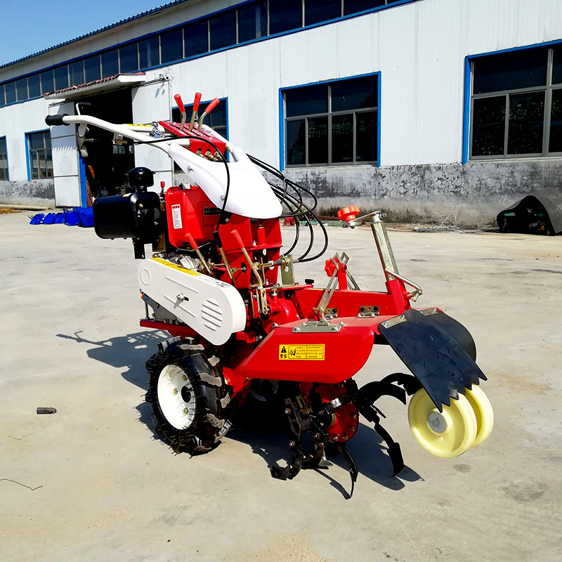 本机器包括机架、可调高低扶手,机架上设有(风冷或水冷)柴油机或汽油机、机架和扶手上设置有变速箱,变速箱的输出轴上设置有能够沿轴移动的驱动轮或链轨.传动方式主要有:全齿轮传动、皮带传动、链条传动三种传动方式.该机具有重量轻,油耗低、相对功率大,结构紧凑、机动性强、操纵轻便灵活的特点。可爬坡、越埂、阶梯性强。广泛适用于平原、山区、丘陵的旱地、水田、果园、菜地、烟地的深旋耕、浅旋耕、犁耕。配上相应机具可进行旱地旋耕、水田旋耕、抽水、开沟、喷淋、喷药除草碎土等作业,还可牵引拖车进行短途运输,是大中型农机无法媲美的多功能田园管理机,工作稳定可靠、使用寿命长、维修方便等特点。是进入农民家庭最理想的田园管理机。
