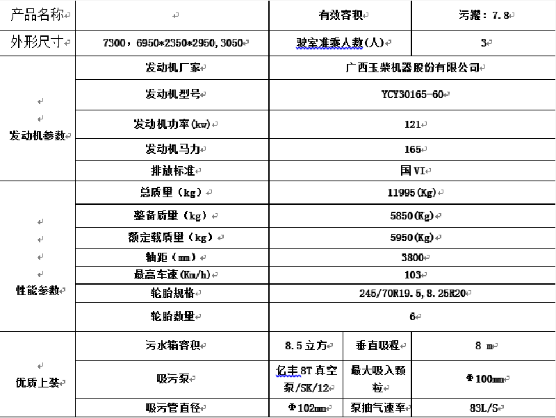 上装配置:污罐:Q235武钢6MM厚碳钢板,罐体封头一次压铸成型,自动焊接,标配采用山东淄博SK/12水循环泵,防溢阀,视粪管,罐体带举升,后盖液压开启,配一根8米吸污管,尾部排粪口严格按照公告外形制作,具有真空度高、吨位大、效率高、用途更广泛的特点。