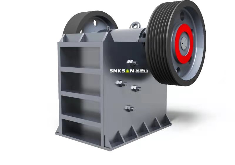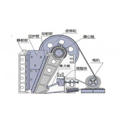 颚式破碎机是由机架、动定鄂板、边护板、传动件、调节装置、飞轮、润滑装置等组成。 颚式破碎机的工作部分是两块颚板,一是固定颚板(简称定鄂),垂直(或上端略外倾)固定在机体前壁上,另一是活动颚板(简称动颚),位置倾斜,与固定颚板形成上大下小的“V”型破碎腔,活动颚板对着固定颚板做周期性的往复运动,时而分开,时而靠近。分开时,物料进入破碎腔,成品从下部卸出;靠近时,使装在两块颚板之间的物料受到挤压,弯折和劈裂作用而破碎。