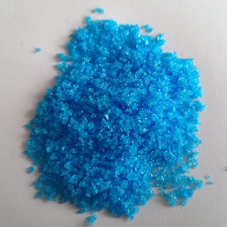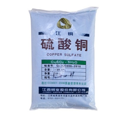 五水硫酸铜理化性质为透明的深蓝色结晶或粉末,在0℃水中的溶解度为316克/升,不溶于乙醇,几乎不溶于其他大多数有机溶剂。在甘油中呈宝石绿色,空气中缓慢风化,加热失去两分子结晶水(30℃),在110℃下失水变成白色水合物(CuS04・H20)。含杂质多时呈黄色或绿色,无气味。本品对铁有很强的腐蚀性。硫酸铜既是一种肥料,又是一种普遍应用的杀菌剂。波尔多液、铜皂液、铜铵制剂,就是用硫酸铜与生石灰、肥皂、碳酸氢铵配制而成的。