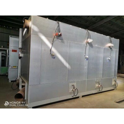 布袋式除尘设备的结构可以分为几大部分,上部箱体、中部箱体、下部箱体、清灰系统,进出风管道。上部箱体有电磁脉冲阀,中部箱体中有布袋(滤袋),骨架(笼骨),花板,下部箱体是灰斗。设备配备自动感应系统、自动灭火系统。布袋除尘器的工作原理为含尘气体从除尘器的进风口进入各分室灰斗,并在灰斗导流装置的导流下,大颗粒的粉尘会随着重力的作用,直接落入灰斗,而较细粉尘均匀地进入中部箱体而吸附在除尘布袋的外表面上,干净气体透过布袋进入上箱体,并经各离线阀和排风管排出大气。随着过滤工况的进行,布袋上的粉尘越积越多,当设备阻力达到限定的阻力值时,由设定程序打开电控脉冲阀,进行停风喷吹,利用压缩空气瞬间喷吹使布袋内压力聚增,将布袋上的粉尘进行抖落至灰斗中。