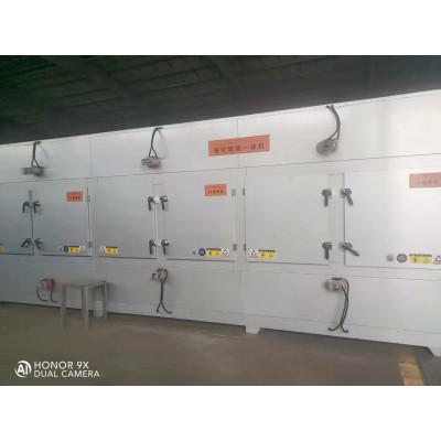 布袋式除尘设备的结构可以分为几大部分,上部箱体、中部箱体、下部箱体、清灰系统,进出风管道。上部箱体有电磁脉冲阀,中部箱体中有布袋(滤袋),骨架(笼骨),花板,下部箱体是灰斗。设备配备自动感应系统、自动灭火系统。布袋除尘器的工作原理为含尘气体从除尘器的进风口进入各分室灰斗,并在灰斗导流装置的导流下,大颗粒的粉尘会随着重力的作用,直接落入灰斗,而较细粉尘均匀地进入中部箱体而吸附在除尘布袋的外表面上,干净气体透过布袋进入上箱体,并经各离线阀和排风管排出大气。随着过滤工况的进行,布袋上的粉尘越积越多,当设备阻力达到限定的阻力值时,由设定程序打开电控脉冲阀,进行停风喷吹,利用压缩空气瞬间喷吹使布袋内压力聚增,将布袋上的粉尘进行抖落至灰斗中。