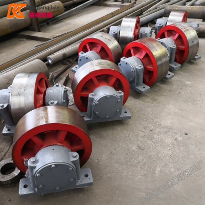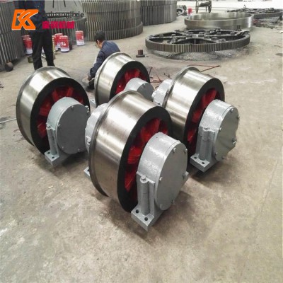 烘干机托轮安装要求:托轮组由托轮、托轮轴及轴承所组成,要求每对托轮安装成烘干机筒体中心与筒体断面中心线的对称位置,且其距离等于托轮与轮带半径之和。此时,通过托轮中心和筒体断面中心连线的夹角等于60°。托轮这样安装时,可以保证筒体稳定性而不致向两侧移动,也不会被托轮挤紧。并要求每个托轮轴都与窑中心线成平行,以保证轮带与托轮表面均匀接触。 轮带与托轮直径之比一般为3~4。