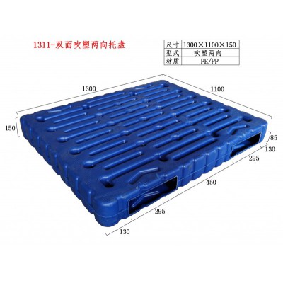 1311吹塑托盘,重量18-24kg,吹塑托盘是以超高密度聚乙烯树脂为原料,采用一流设备以及世界先进的吹塑工艺生产,它具有质轻、高抗冲击强度、耐腐蚀、经久耐用、承载力大、防滑等优点。产品广泛用于化工、食品、医药、交通、邮电、物流等行业,是现代仓库、车站、码头货物承载、贮存、搬运、周转和运输的必备工具。吹塑托盘是国际流行的塑料托盘产品,随着世界化环保意识的增强,森林资源日渐匮乏,塑料托盘取代木质、铁质托盘已成为必然趋势。