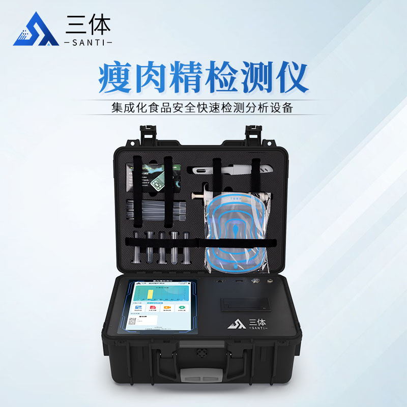 三体仪器生产的瘦肉精检测仪可现场快速检测盐酸克伦特罗、莱克多巴胺、沙丁胺醇、己烯雌酚、喹乙醇等。仪器预留其他项目检测程序和端口,根据日后需求可进行远程设备升级。日后可升级为检测抗生素、兽药残留、动物疫病等检测项目的综合类型仪器。