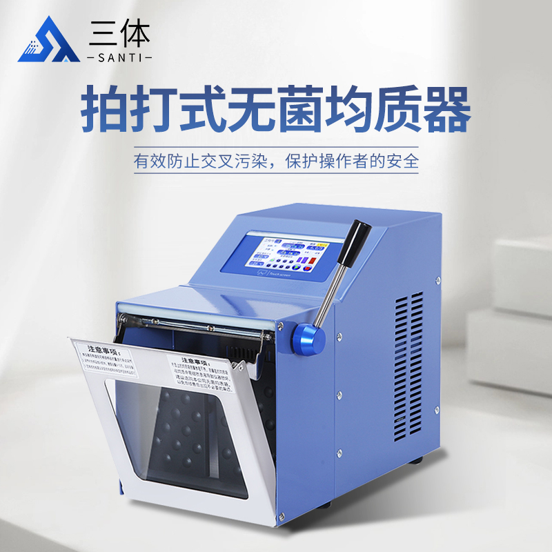 微生物样品的原始状态可能是块状、糊状、粉末状等等,都须将其制成细化的液体状样品,才能有利于微生物的分析和接种。经本仪器的锤击板反复在样品均质袋上锤击,产生压力、引起振荡、加速混合、从而达到溶液中微生物成分处于均匀分布状态。本仪器适用于脑、肾、肝、脾等组织及微生物的均质处理,广泛应用于食品、药品、临床、分子学、毒素及细菌检测等领域。