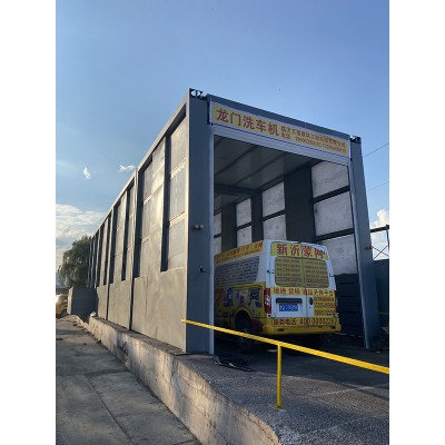 智能龙门洗车机设备1套,设备长度25米,宽5米、高度5米。冲洗区15米,风干区10米,采用双层钣金件封闭喷水管路保温,配置3台15kw高压水泵,8套风机(热风机7.5KW4台、冷风机5.5KW4台)加不锈钢风刀,落地式控制柜PLC控制配触摸屏实现手动启动、自动感应、手机远程控制、面板转换开关手动切换模式,进车口设雷达防撞道闸红绿灯警示,设备内部设有防水LED照明等警示装置,钢结构框架内镶嵌8mm阳光板,内三角门锁,喷嘴选用304不锈钢材质,镀锌管路配有保温,水箱后背板加装高密度橡塑海绵,提高洗车机保温性。