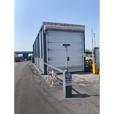 车辆进口位置防撞柱,设置红外对射感应装置,当车辆进入洗车台时,通过红外对射开关或车牌识别摄像头,自动开启道闸抬杆和入口处自动门,水泵喷水,车辆行进过程中冲洗车轮与车厢侧板和底部,车辆继续前行,当设定的冲洗时间结束后,所有水泵全部关闭,可设置延时开关时间,延时结束时间,车辆驶至风干区,热风机和冷风机启动,延时断开风机,绿灯亮,出口处门打开。
