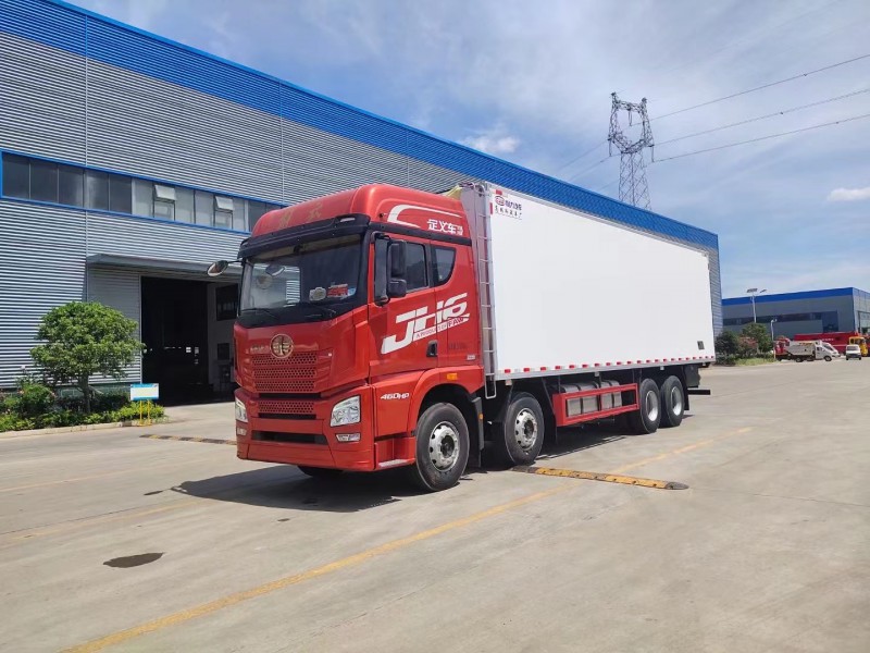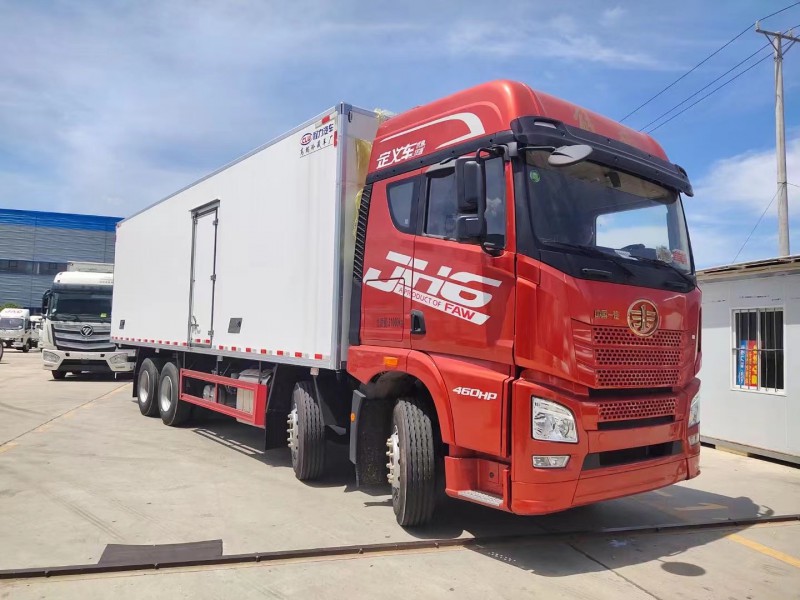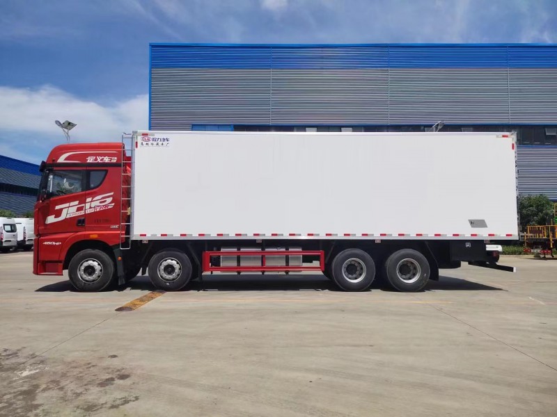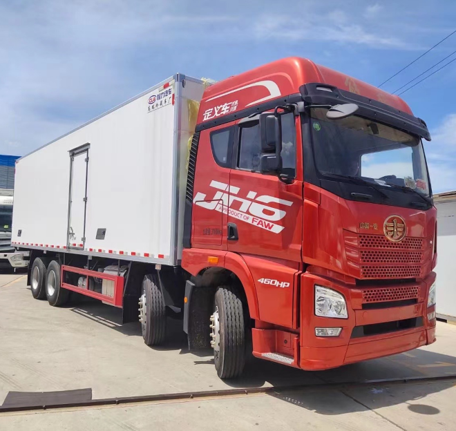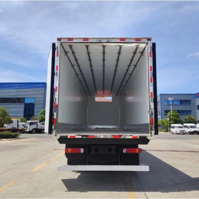 5排直立肉钩导轨,厢体采用内外玻璃钢,冷藏车专用保温材料。木包镀锌管箱体骨架,采用断桥隔热工艺。底板铝花纹板,开单侧门,铝合金型材包边,门锁件均为不锈钢,后双开门,加工具箱,加爬梯,配开利850独立制冷机组。