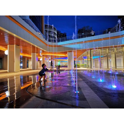 跑泉:是程序控制喷泉的一种精进种类,由电脑和数码控制阀等联动,施工时采用线性喷头施工,用程序控制喷头的开闭和高度,从而在瞬间形成像是奔跑和流动的线条喷泉一样,科技感十足,且能大幅度带动周围游客的心情。