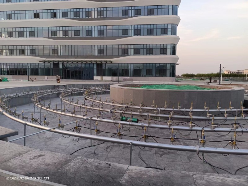 跑泉:是程序控制喷泉的一种精进种类,由电脑和数码控制阀等联动,施工时采用线性喷头施工,用程序控制喷头的开闭和高度,从而在瞬间形成像是奔跑和流动的线条喷泉一样,科技感十足,且能大幅度带动周围游客的心情。
