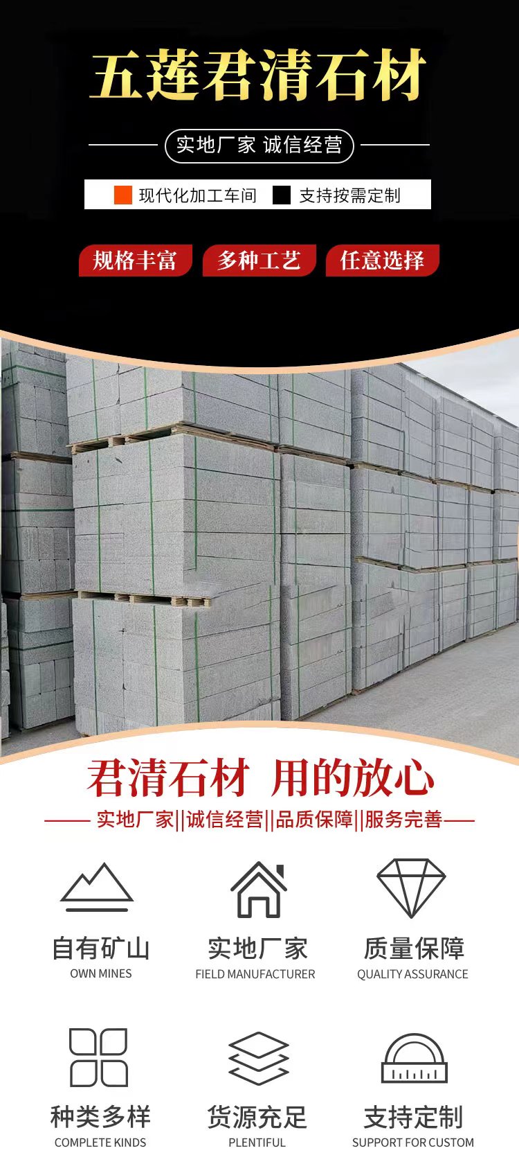 主营产品: 各种花色的路沿石,火烧板,S形路沿石及各种异形石材